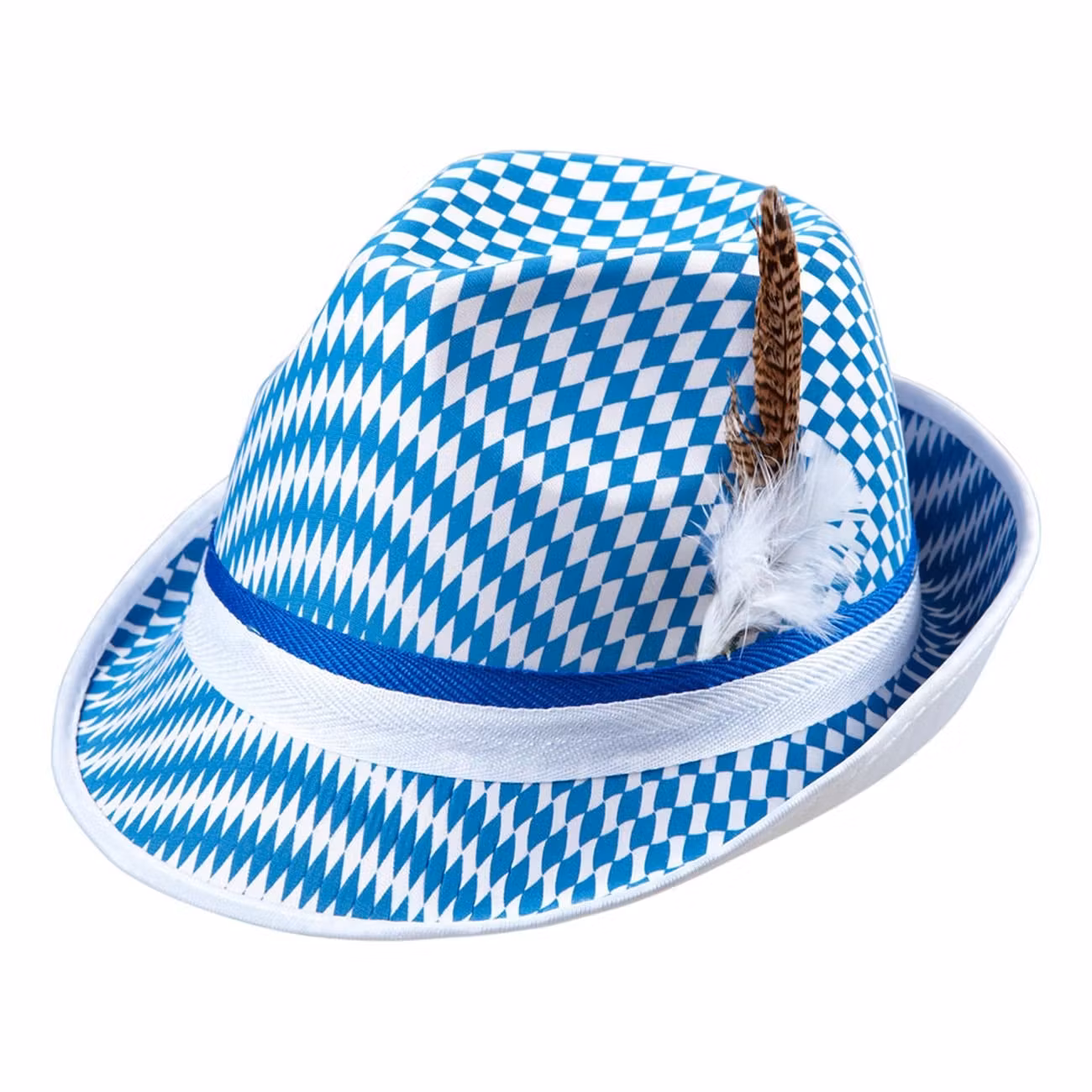 Bavarian Filthatt med Fjäder kommer i det klassiska bavariska utförandet i blått och vitt i ett rutigt mönster. Runt hatten finns ett blått och ett vitt band samt en tjusig fjäder.