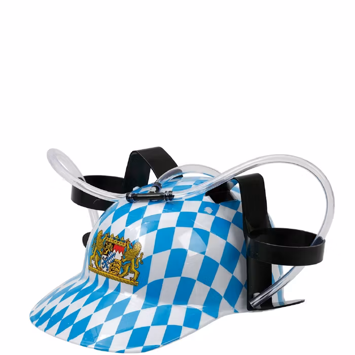 Sätt pricken över i:et på din Oktoberfest-outfit med denna episka Ölhjälm i blåvitt Bayern-mönster! Hjälmen har plats för två ölburkar, som hålls på plats i sidofästena. Via de genomskinliga drickslangarna, som möts i en munslang, kan du luta dig tillbaka och sippa handsfree – precis som en riktig festkung!